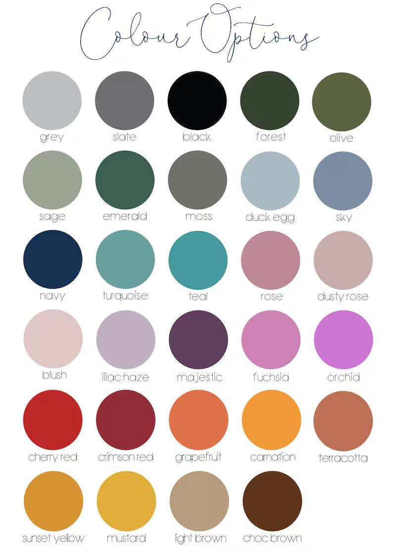 Choose from the colours provided in the colour option photo's, Or message me for a custom colour.